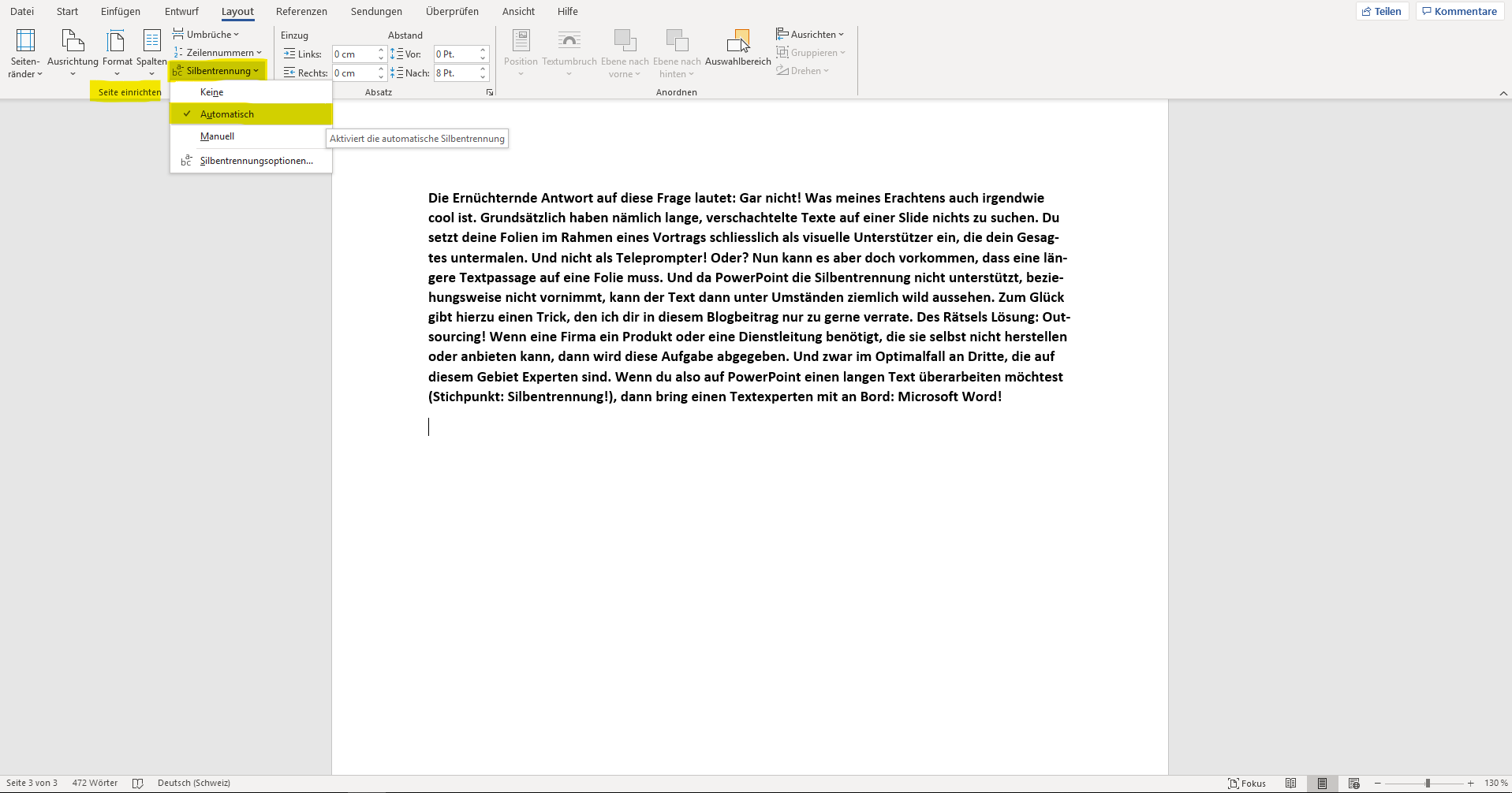 Automatische Silbentrennung Powerpoint: • ausschalten der silbentrennung silbentrennungen (an einigen stellen verhindern, an anderen stellen erzwingen).
